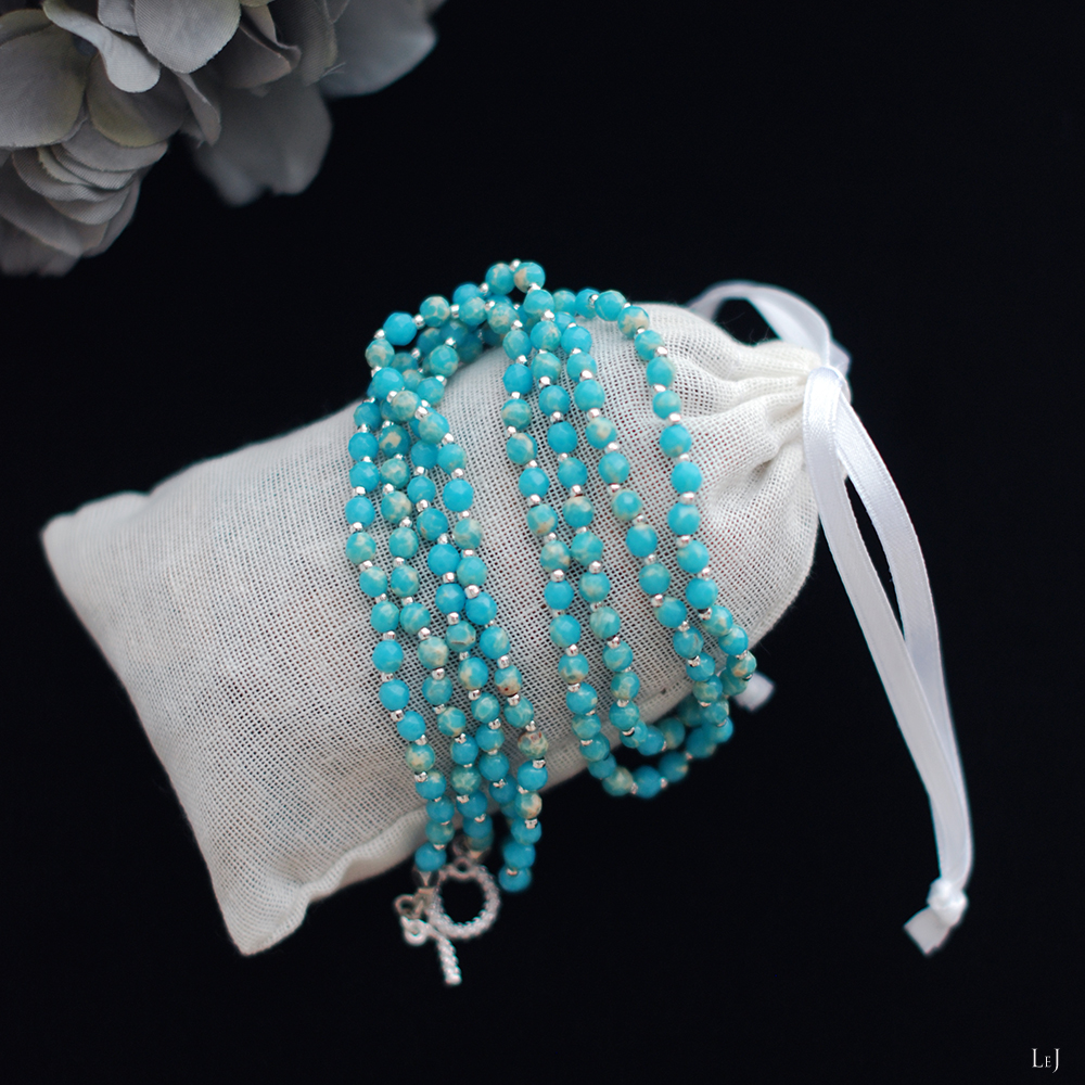 ⌀4mmのジャスパーに明るいシルバー色のパーツを加えてしっかり結び留め、自然なアールを描いてショートネックレスやブレスレットとしても楽しんでいただけるようにしました。小さくても絶妙なマチエールを抱いていて、その可愛らしさに頬が緩みます。