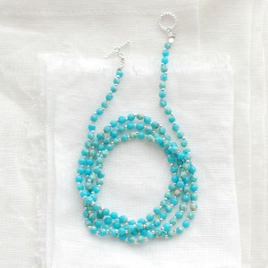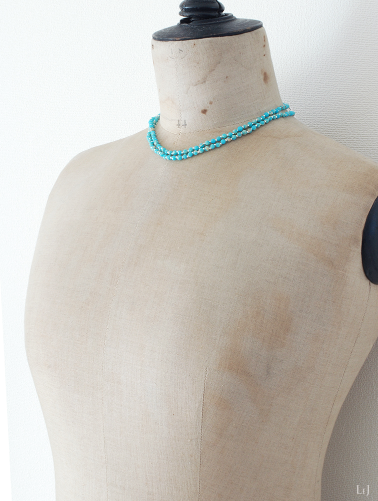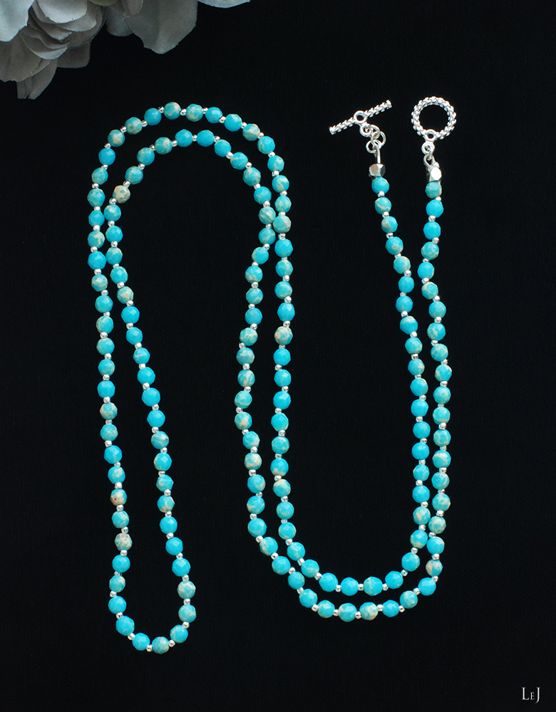 ころころした、丁寧なカットがほどこされたブルーインプレッションジャスパーで作った81cmのネックレス。
