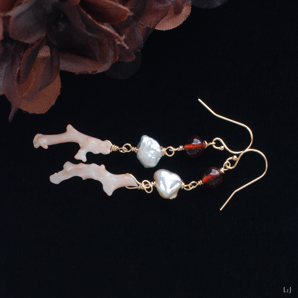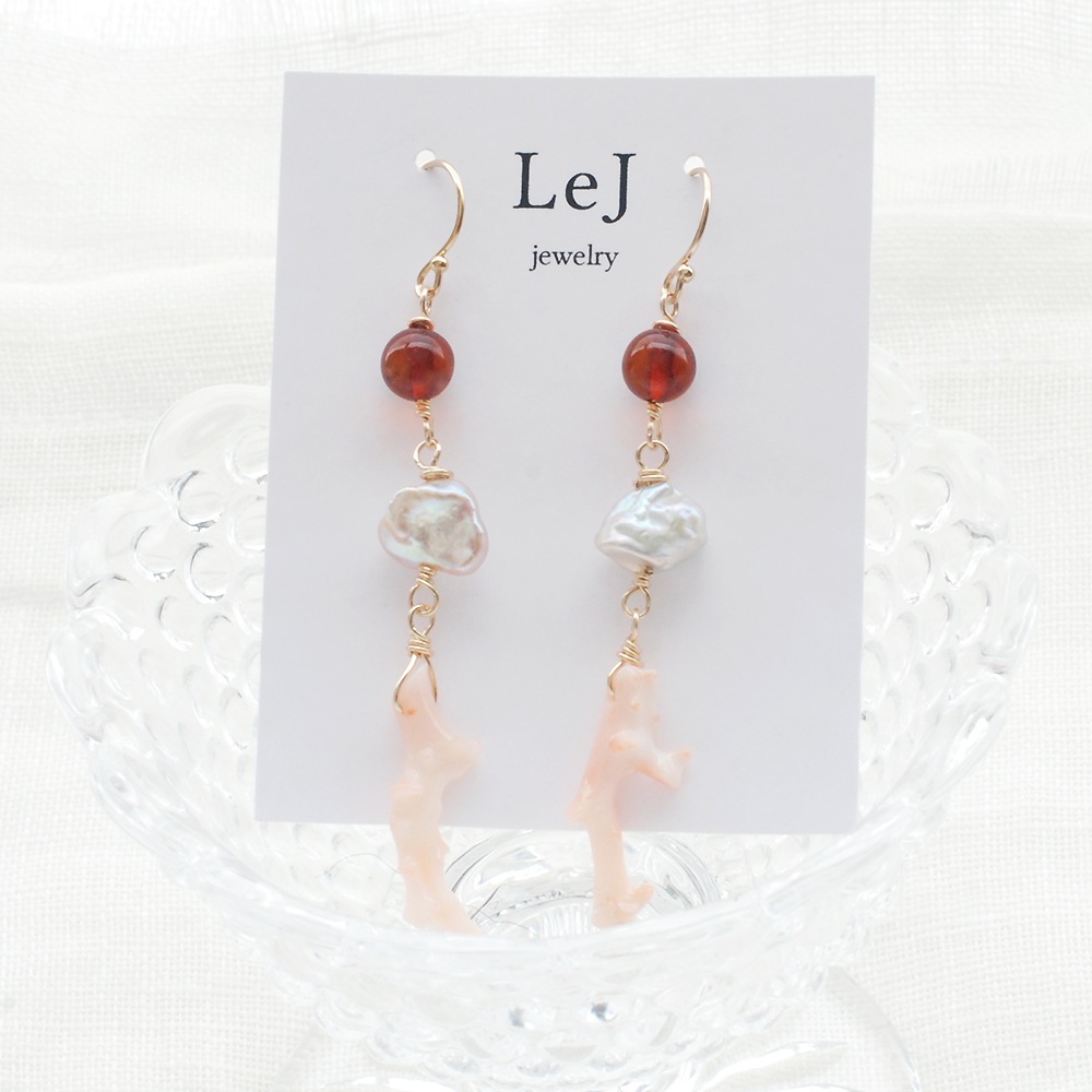 琥珀とケシパールとピンクのブランチコーラルのピアス Dolce32 をONLINE STOREに公開しました。