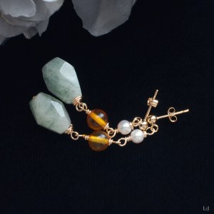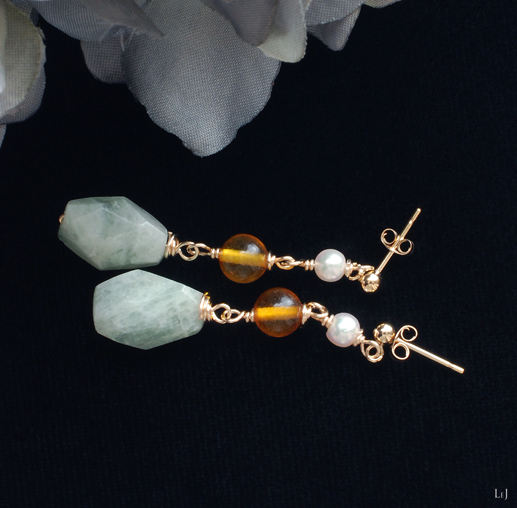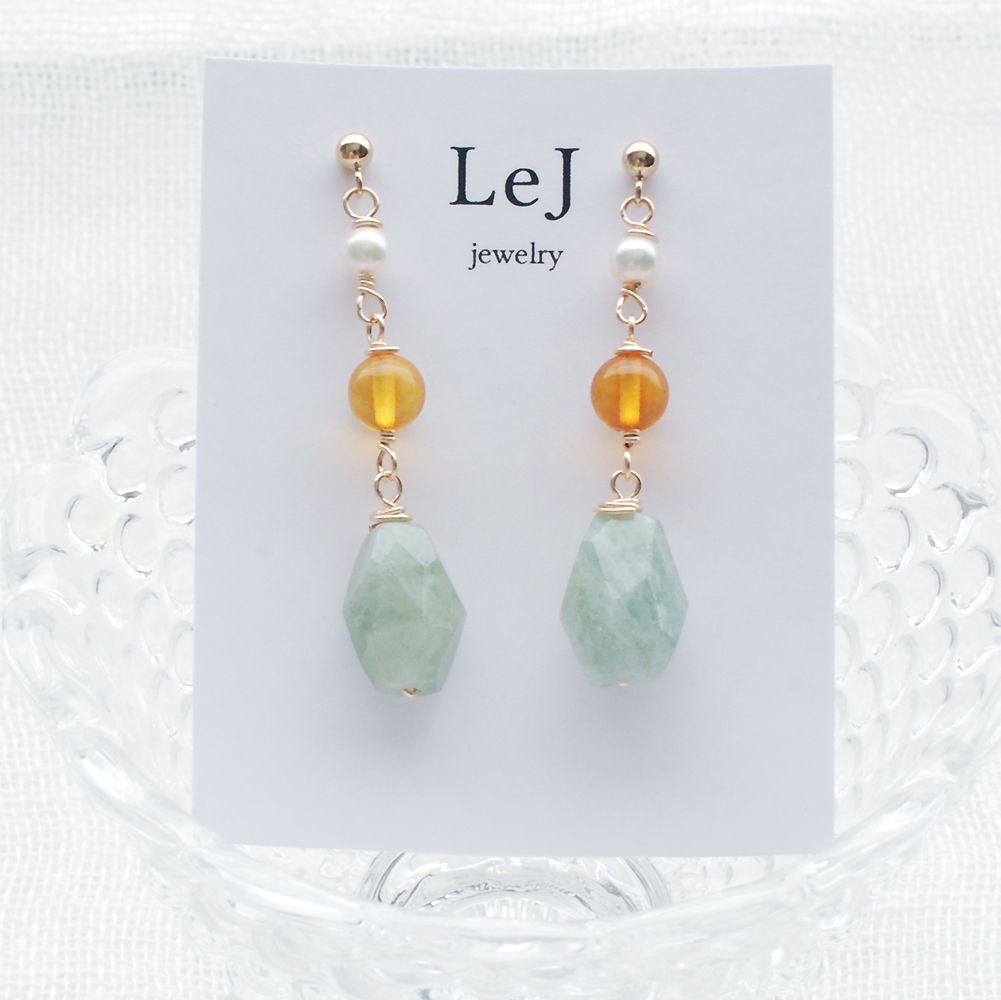 ペールグリーンはアクアマリン、琥珀とアコヤパールはLeJのいつもの組み合わせ。着けてみると、ごくごくやわらかなベッドサイドのランプのように琥珀が光を通して華やかさを添えます。その光がお顔のなかで目の力を引き立てる存在になる、そんなジュエリーです。