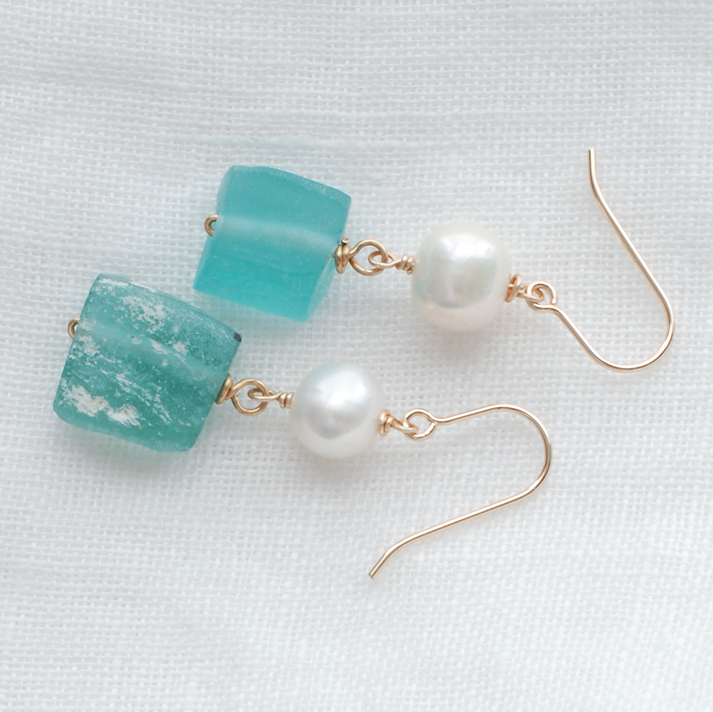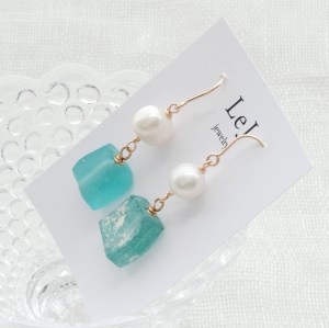 プリミティブ(素朴・原生的)な雰囲気を持ちながらも、LeJでは美しいガラス素材として製作に使っています。パールのジュエリーやシルバーのジュエリーとも仲良くなれる素材なので、コーディネートをお楽しみいただければと思います。ピアスホールからの長さは46mm。ローマンガラスは13×13×6mm。