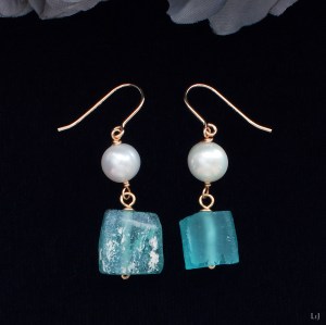 そして2000年の時間を経て地中に埋もれたガラスが自然の作用によって銀化、その部分が白くなったり孔雀の羽のような色彩を展開したりと表情を変えます。美しいクリーミーホワイトのパールと合わせてやわらかな印象のピアスに仕上げました。