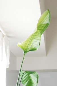 写真はキッチンに置いている植物。一番上の葉はかたく巻いて葉巻のようなかたちをしていたのに、お風呂から出て来るとこんな風にぱっと開いていました。