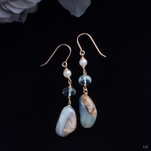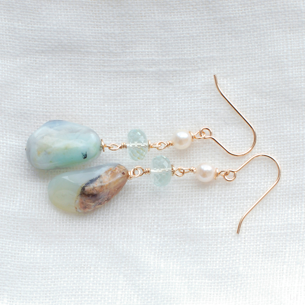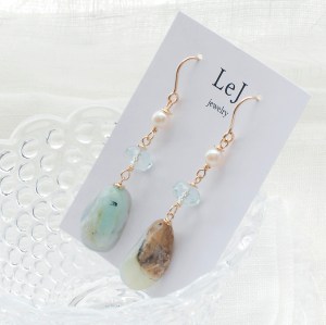 ほんのりとマチエールをもつブルーオパールにきらきらかがやく精緻なカットのアクアマリンとアコヤパールを合わせたピアス Dolce39 をONLINE STOREに公開しました。