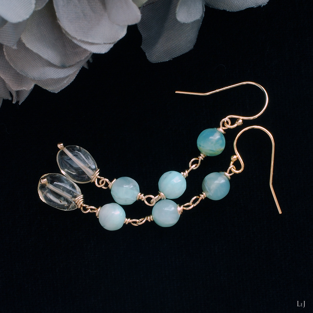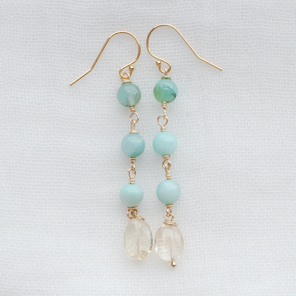オーシャンブルーやエメラルドグリーン、ミルキーホワイトなどの自然のいろが溶け合ったようなグリーンオパールとシトリンのピアス。
