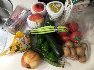 傘もひっくり返りそうなほどの風雨でしたけれど、この八百屋さんが来てくれないために私の食生活のバランスがおかしくなっていましたからなんとも言えない嬉しさがありました。大雨だったうえに痛む背中をかばってのお買い物、この量が精一杯でした。二ヶ月空いたのち私が最初のお客さまで、八百屋さんは久しぶりだねととても喜んでくださいました(笑)