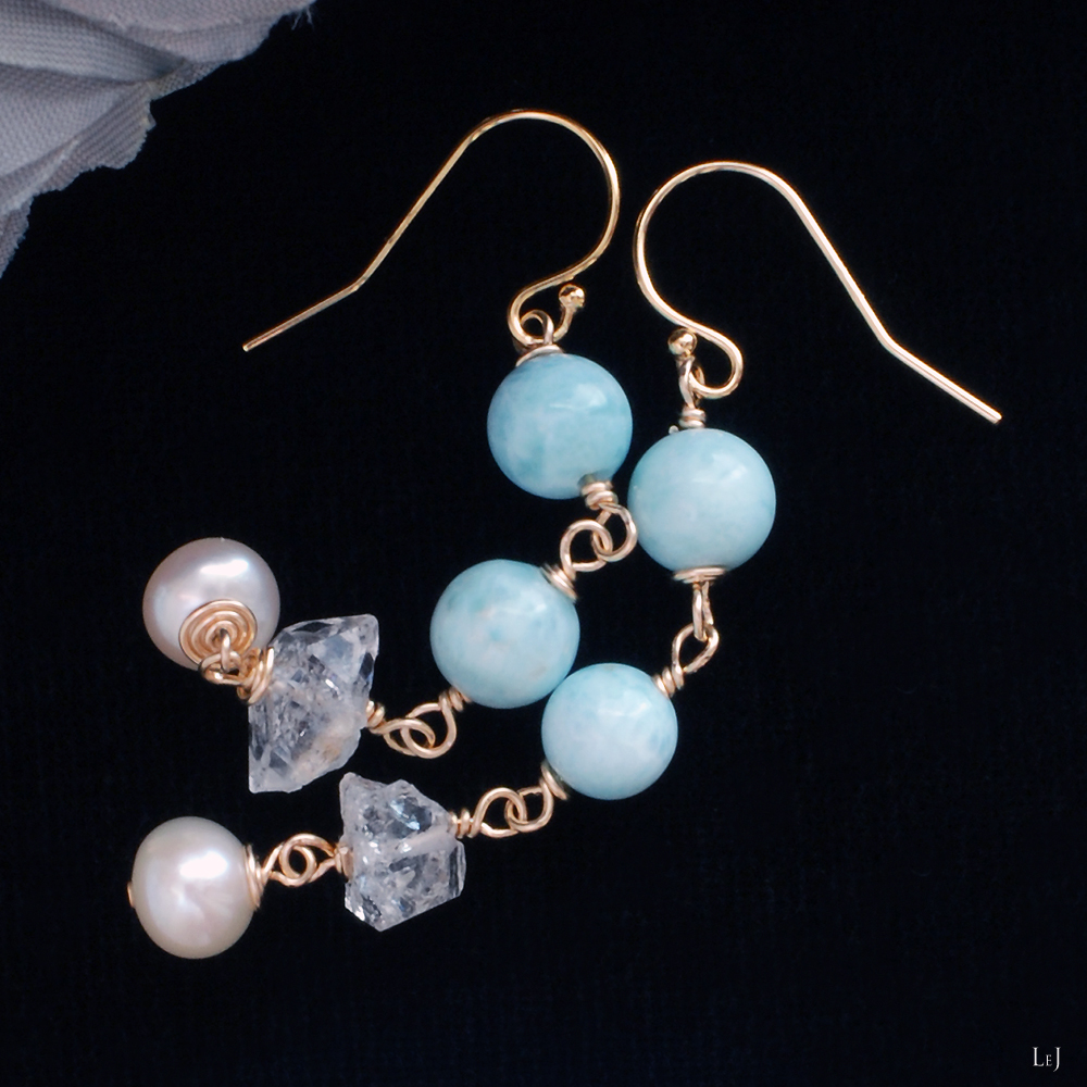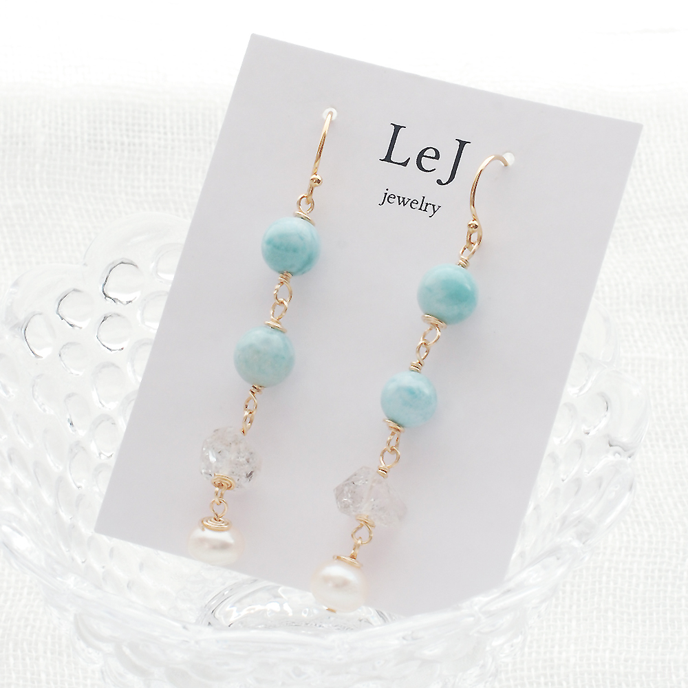晴れ渡ったそらのようなブルーのラリマーとハーキマーカットクオーツ、パールのピアス Dolce60 をONLINE STOREに公開しました。