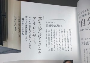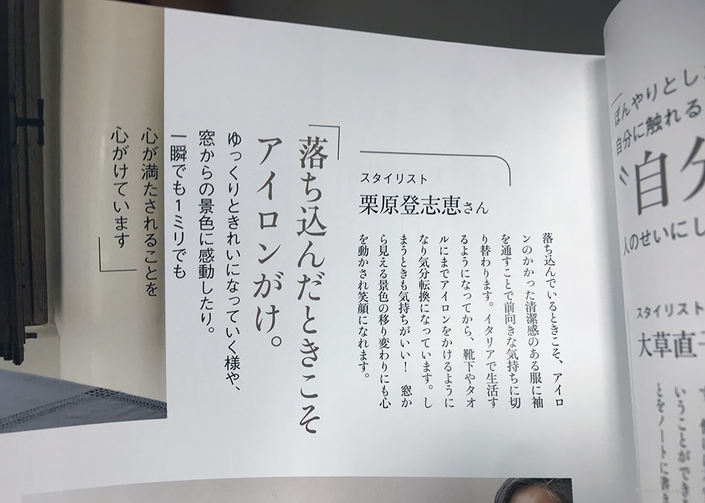 ずいぶん前に美容室で読んだ雑誌のページ、気分転換にアイロン掛けをするという人が私以外にもいるのだと読んで、嬉しくなりました。汗をかきながらもぴしっとしたアイロン掛けの仕上がりは無心になり心をすーっと達成感へと導いてくれます。