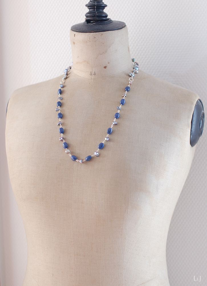 LeJでは初めて使う天然石素材、デュモルチュライトと美しい光沢のケシパールを合わせたネックレス Nicole(ニコル)。