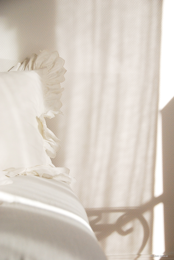 このクッションカバーはいつからあるのか覚えていないくらいのラルフローレンのホームコレクションのもので、写っていないけれど同じように白いリネンの正方形のクッションカバーは25年くらい使っているもの。ソファはまだ8年くらい、でももう十分にクッション部分がダメダメになっているけれど、コットンガーゼのカバーを付けたらよい感じになりました。フランスアンティークのアイアンの白いテーブルが影を作っていて、ボローニャで買って帰ったボルゴデルトヴァーリの麻のカーテンがちょうど良い感じで光を通します。