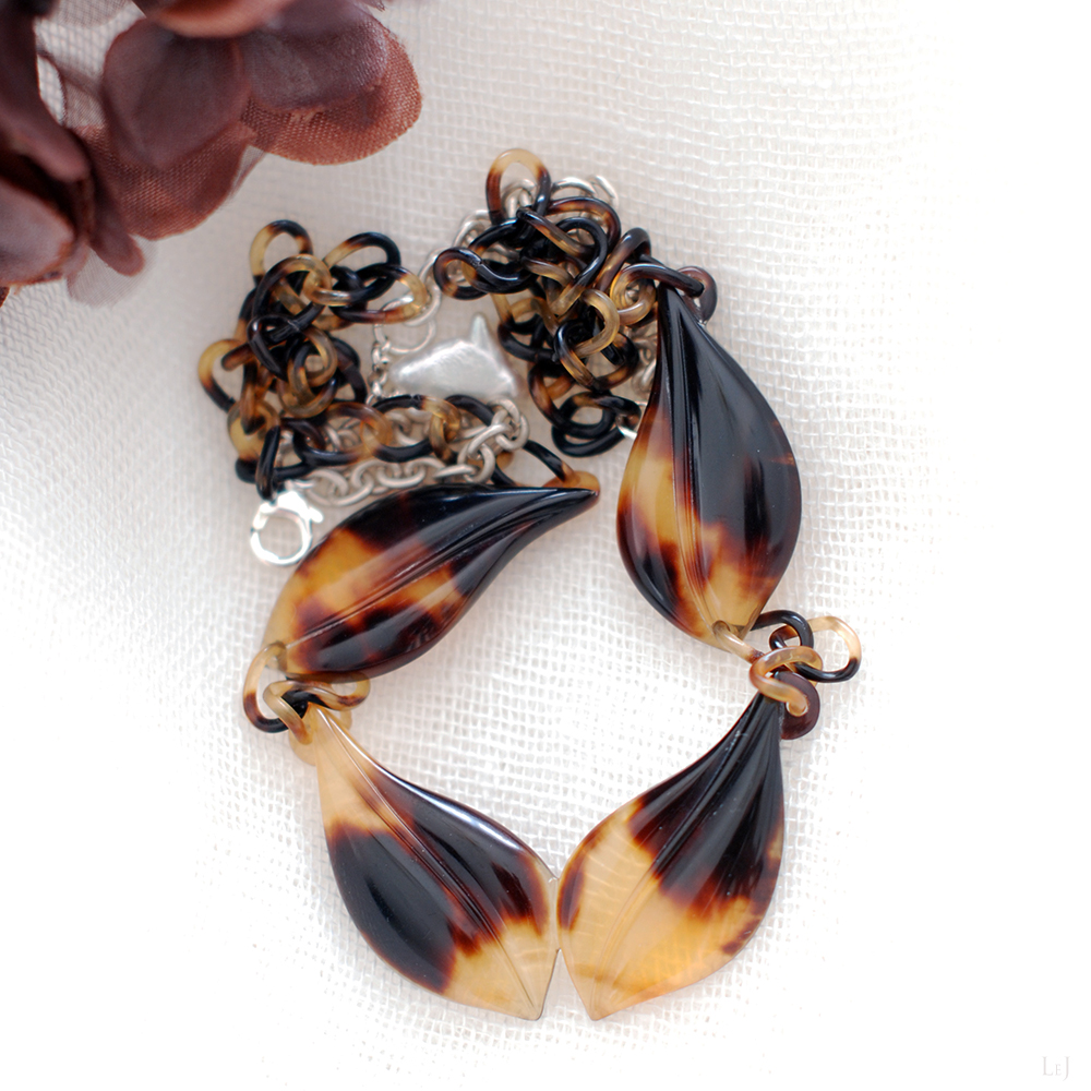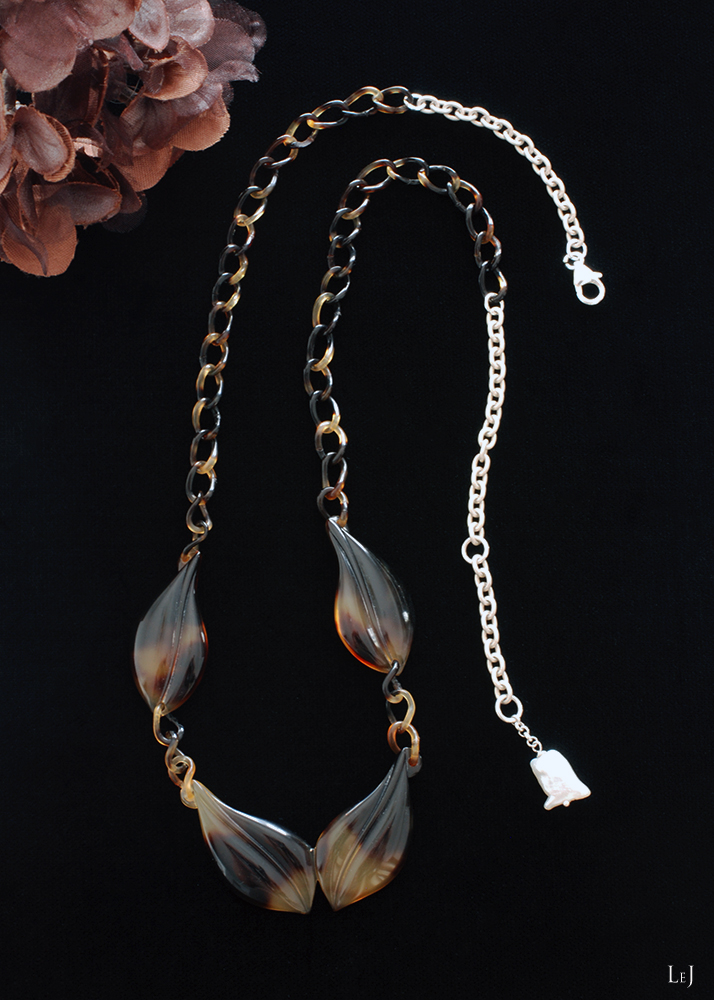 思わぬところで、鼈甲(べっこう)素材の葉を連ねたモチーフと出会いました。中央の葉は繋がったまま加工されていて、パールのピアスやイヤリングとも仲良くなれそうです。すべすべとした仕上がりでとても大人っぽくてシック。長さは53,5cmでプラス35mmのアジャスター。