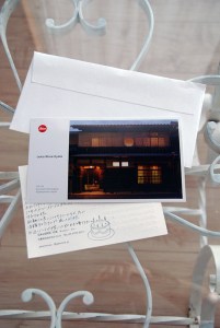 そういえば2,3日前にさっと放り込んだものがあったことを思い出しました。それはライカとブティックからのもので、びっしりと小さな文字で綴られた手書きの内容は誕生日のお祝いでした。京都の町屋の風景のものはライカから。裏面には心がこもった文字が書ききれないくらいに綴られています。