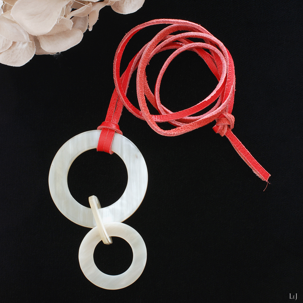 自然素材がもつ温かみと軽やかな着け心地、パールやゴールドなど他の素材のジュエリーとも仲良くなれるのも魅力です。大小二つのリング状のモチーフを合わせて、クリアレッドの革紐と合わせました。きれいな落ち感が出る仕上がりです。