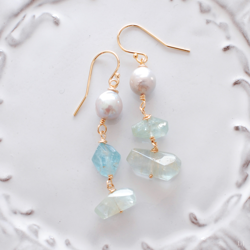 すべらかなアクアマリンとほんのりやわらかなライトシルバーのアコヤパールを合わせたピアス。アクアマリンは、そのクールさのなかに秘めた穏やかなトーン展開が魅力です。
