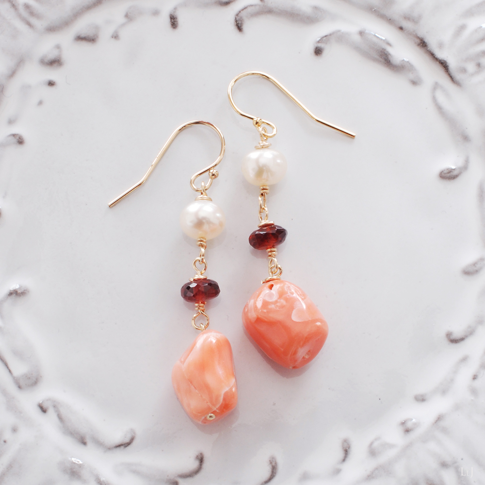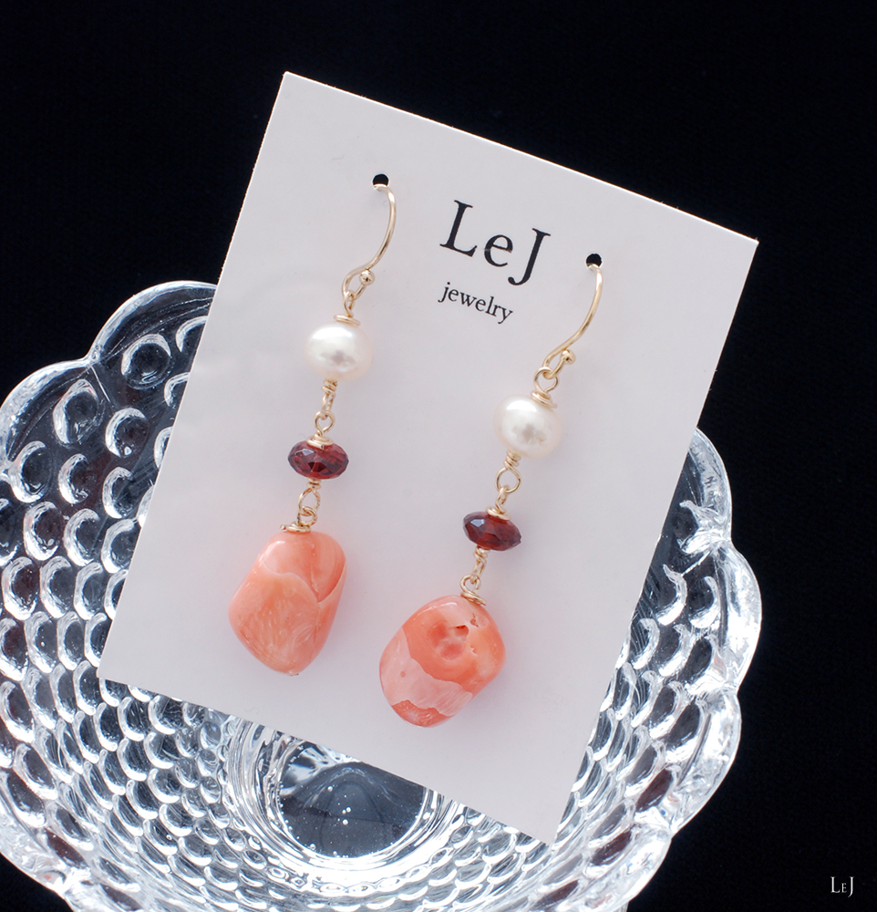 LeJが大切に使っているナチュラルコーラルとつややかなパールやガーネットのピアス Dolce68 をONLINE STORE公開しました。