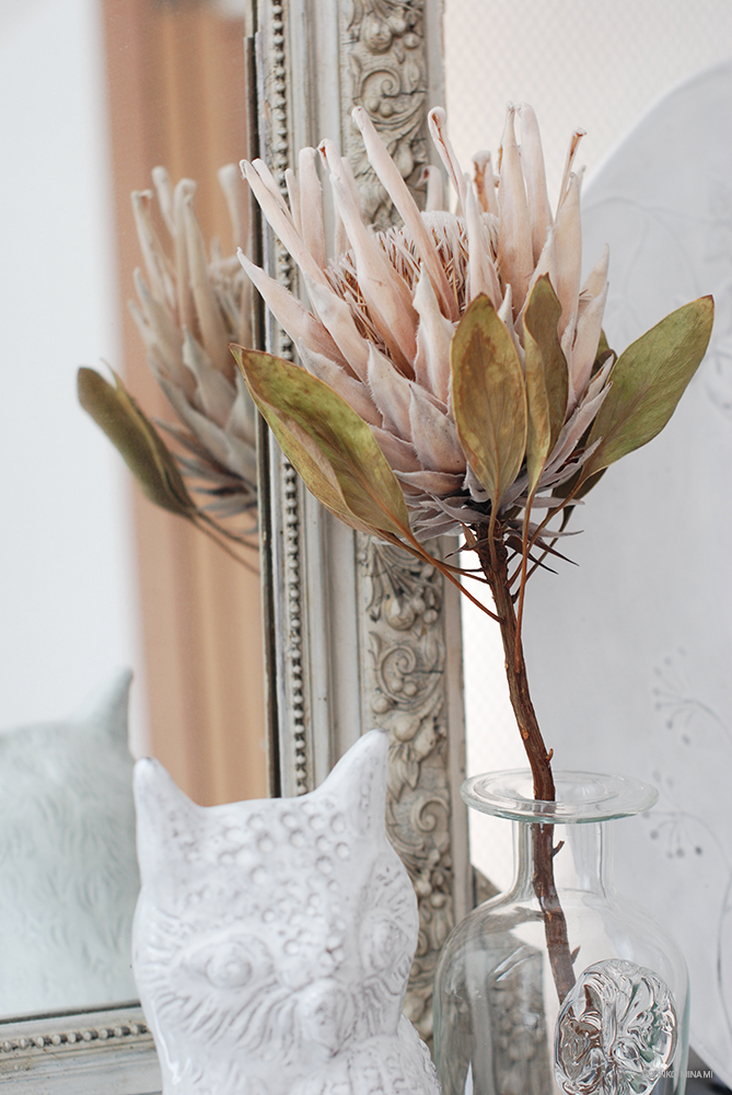 同じように大好きなキングプロテア、お友達が誕生日のお祝いに贈ってくれてしばらくドライフラワーにしていましたが、ガラスに挿してみました。フクロウのアスティエと同じトーンでよく似合います。今日は一日雨、日中の19℃から下がって来て今は12℃。気温の変動に要注意だけれど、明日は湿度20%台の快晴の予報です。
