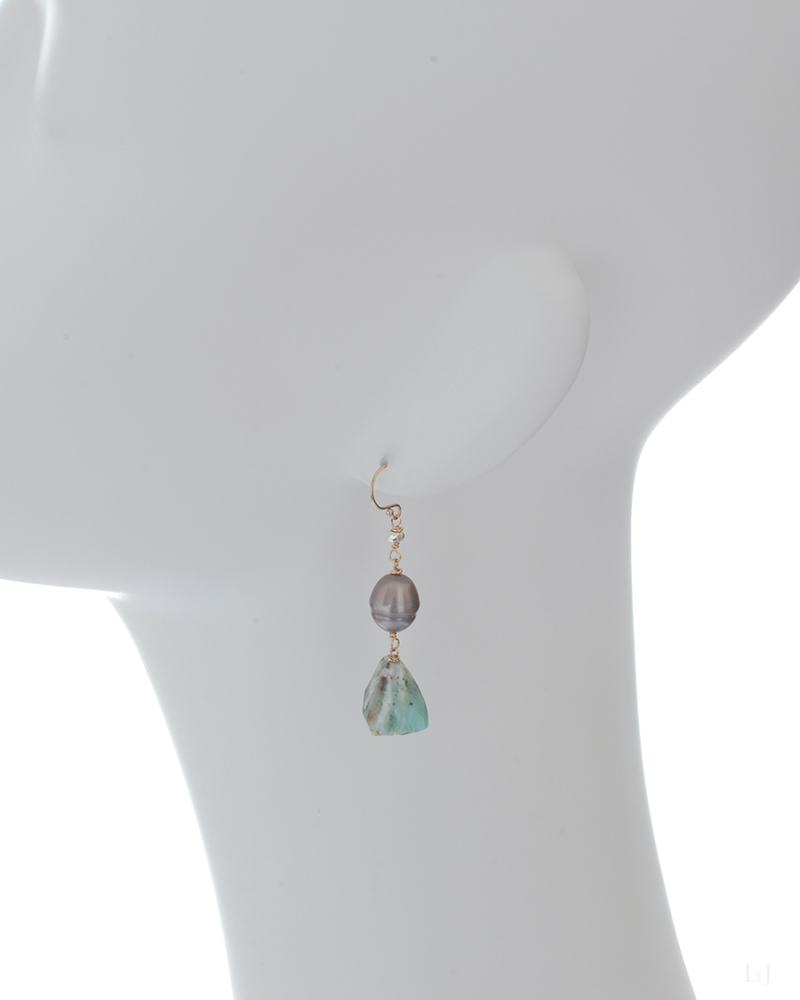 なかでも、初期からずっと変わらず使っているものにブルーオパールがあります。夏のコンパクトでシンプルなノースリーブのウエアにも秋からのボリュームニットにもしっくりと馴染むのはこの素材のよいところだと思っています。そのマチエールは見ていて飽きることがありません。今回はパイライトと大粒のバロックパールと合わせています。ピアスホールからの長さは53mm。抑えたトーンがグレイ系やベージュ、ブラックなどによく似合います。
