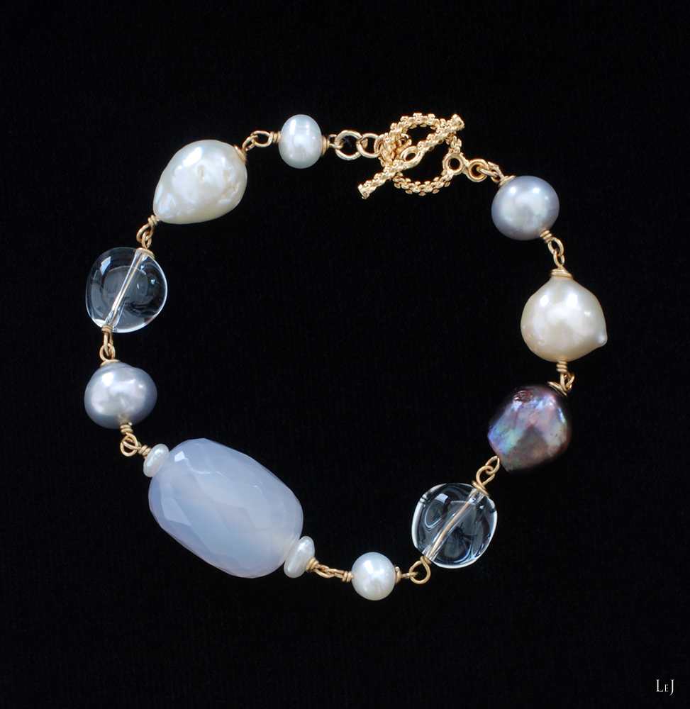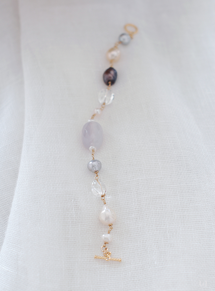 LeJのパールのストックから、表情ゆたかなひと粒ずつのパールを選びました。この世にたったひとつ、お手元に届くように生まれてきた、そんなジュエリーです。内径15cmの方にほどよくフィットします。長さの調整はお申し付けください。カルセドニーの微睡むようにとろりとしたカットとパールの優しい光沢と発色がとてもきれいです。