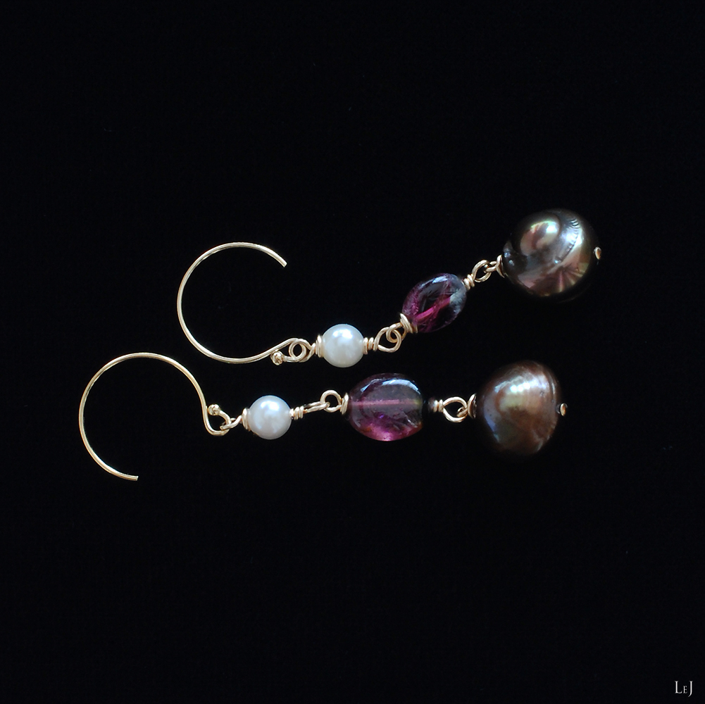 ほんの少しのグレイが混ざったダークブラウンゴールドの淡水パール、赤ワイン色のトルマリンとアコヤパールのピアス Dolce70。