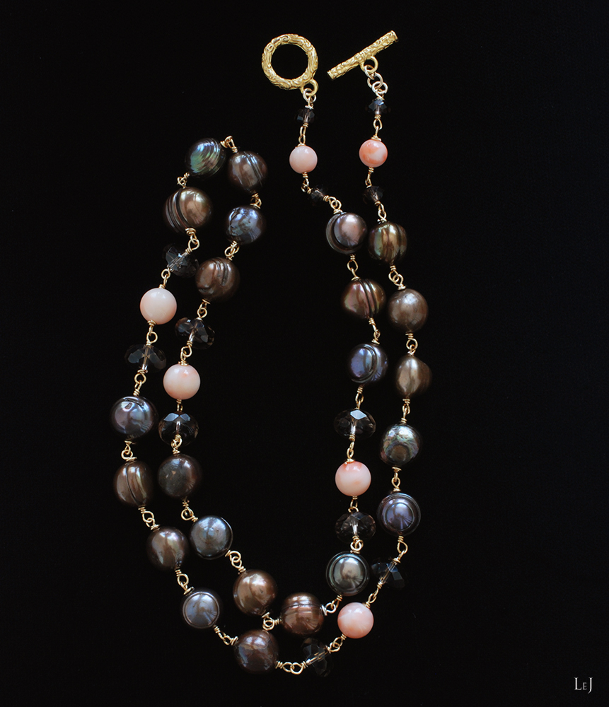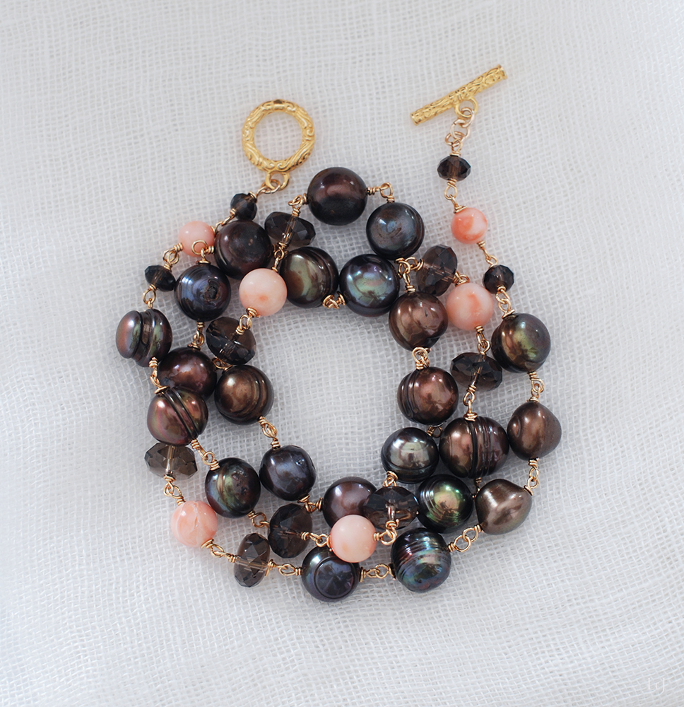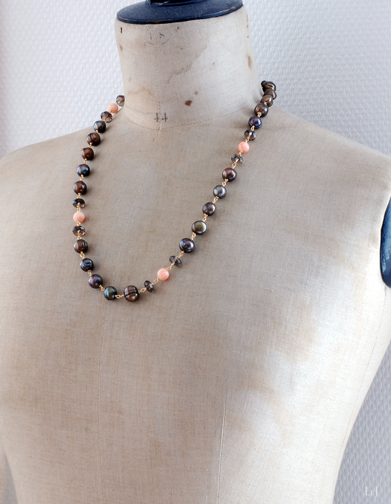 ネックレスも数点作りました。そのうちの2点はすぐのお届けになりましたが、今日の画像は、数種類のトーンのパールにファセッテドラウンデルカットのスモーキークオーツを合わせ、天然の珊瑚を散りばめたネックレスです。大粒のバロックパールと⌀8mmの珊瑚を使った、大人の女性に似合うジュエリーになりました。ダークチョコブラウンやピーコックブラウン、少しグリーンがかった色など、パールならではの色の揺らぎが温かみを持ち、華やかにデコルテを彩ります。長さは63cmです。秋冬の薄番手のニットやもこもこしたセーターに合わせるとパールのなかの珊瑚の甘さが引き立ち、シンプルにジャケット下にもお着けいただけます。
