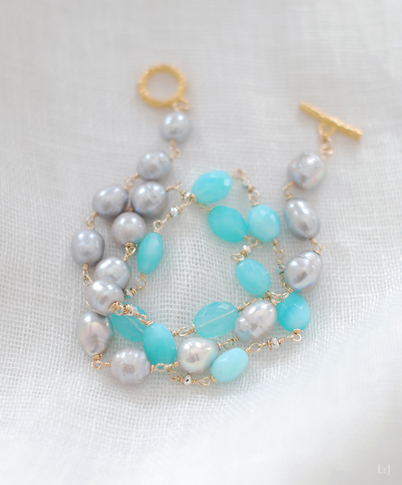 発色がとても華やか。大人の女性の甘さを感じさせる仕上がりです。テーブルに着いた時に視界に入る57cmの長さ、曖昧レングスが新鮮。3連のブレスレットとしてニットの上から着けていただいても素敵です。ブルーオパールは、diaryのバナー画像のネックレスに使っているブルーオパールと同じものです。