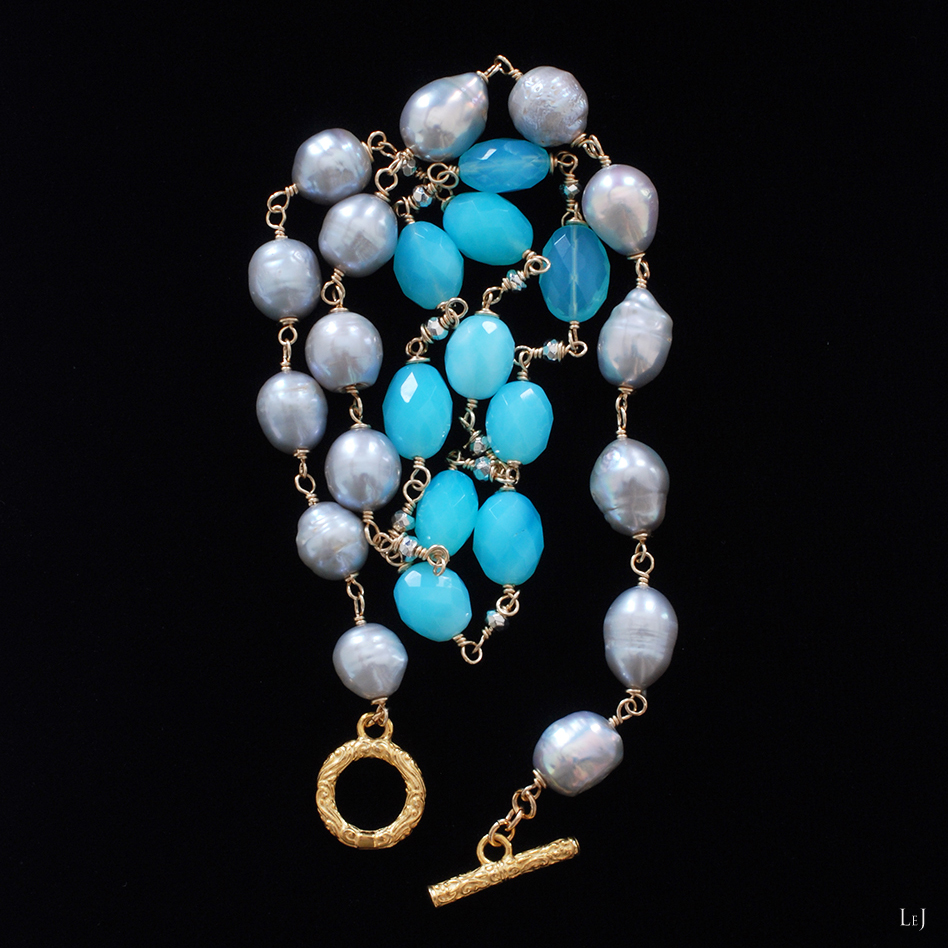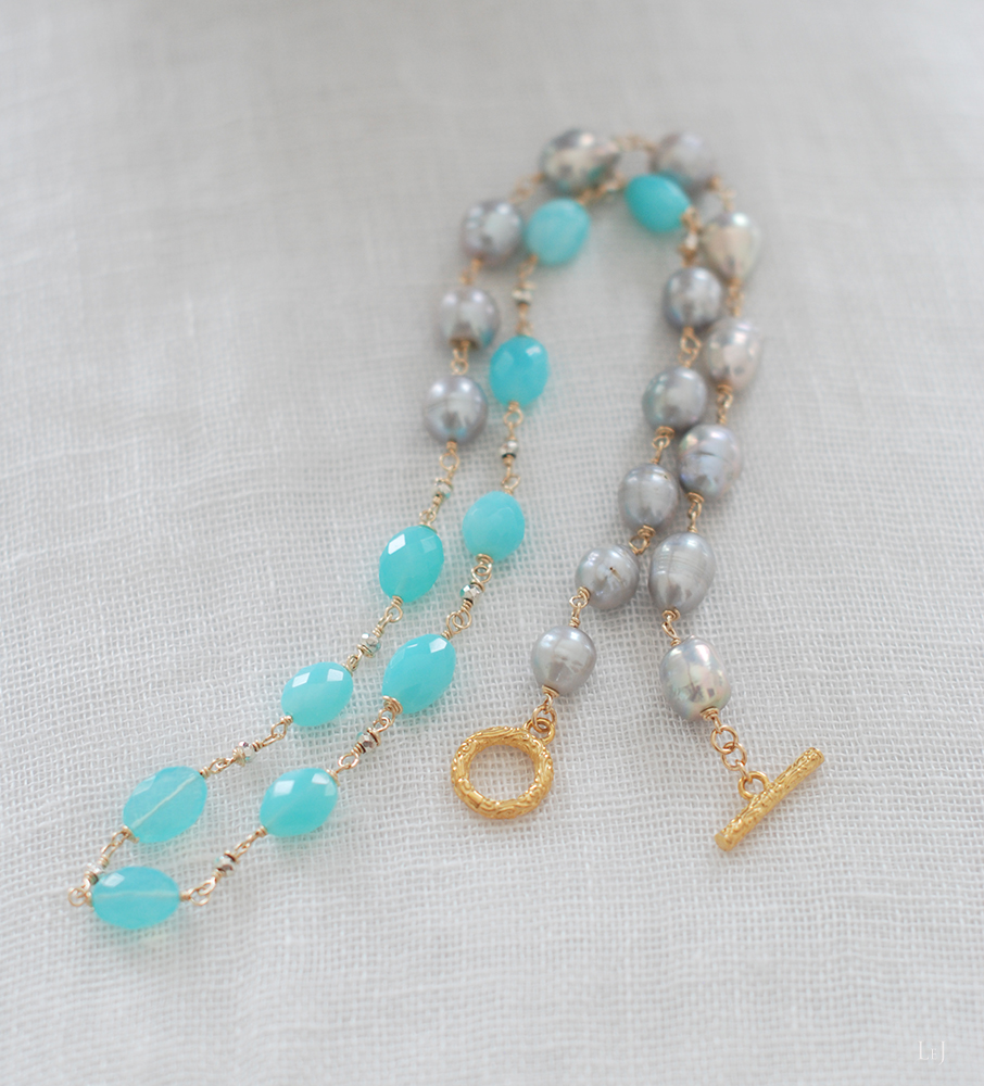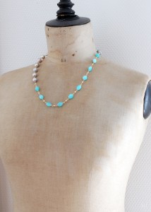 プラチナシルバーの光沢がきれいなパールとミントブルーのブルーオパール、あいだにはパイライトを効かせてミドルレングスのネックレスを作りました。