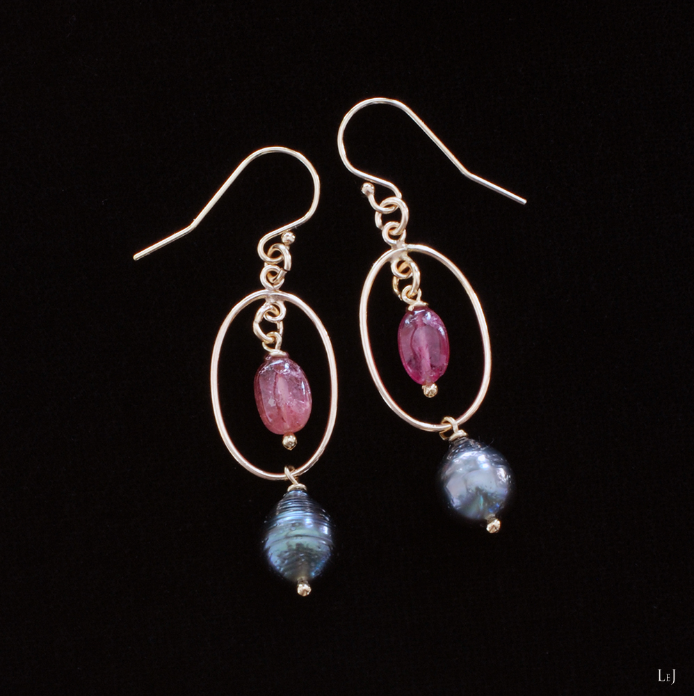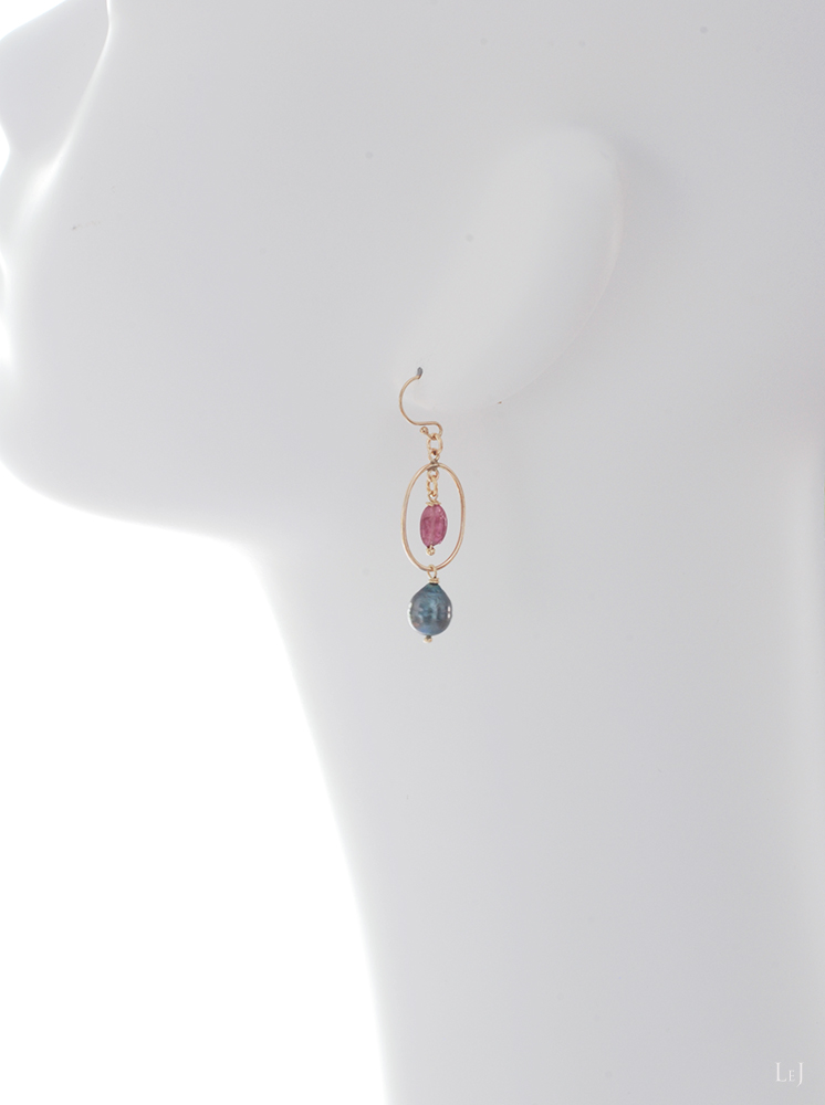 大人のsweetのピンクトルマリンとシックなタヒチ黒蝶パールを、K14ゴールドフィルドパーツに合わせたピアス。