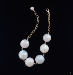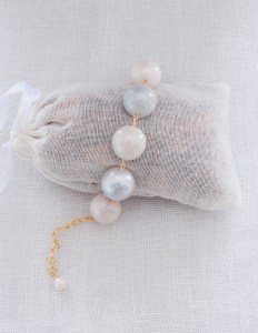 なかなか目にすることがない白蝶パールを、とても贅沢に使いました。細番手のニットから覗かせると素敵だと思いますし、夏には涼しげに。アジャスターの先には小さなアコヤパールを添えました。パールを日常使いにしていただければ嬉しく思います。