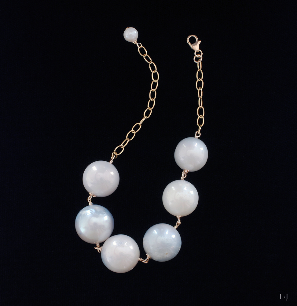 白蝶パールをLeJで使うのは初めて、その魅力は華やかさと気品、そしてほかにはない大きさです。⌀12mm近い粒で、色彩をバランスよく配しました。内径13cmから19cmのかたに。リストが華奢なかたには、ご希望によりアジャスターをカットしてお届けします。ONLINE STOREのご決済時に備考欄にてお申し付けください。