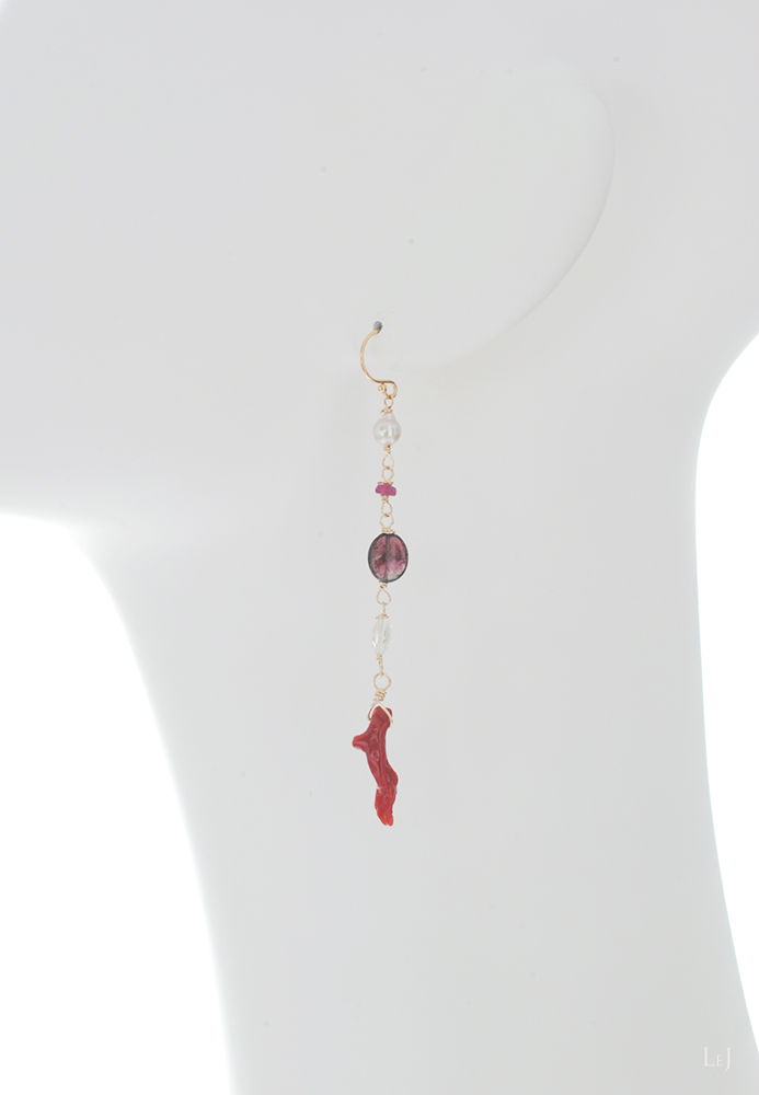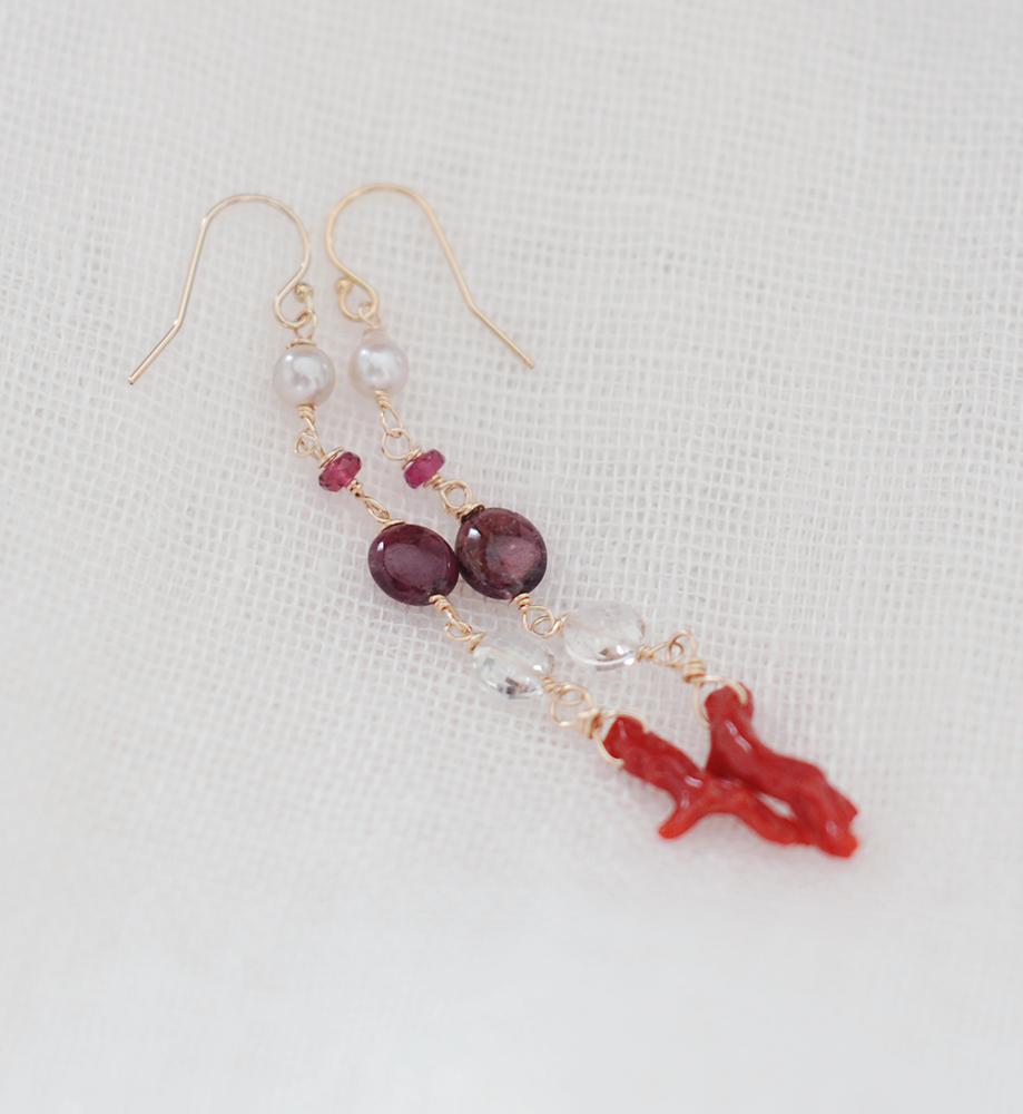 ルビーやトルマリン、トパーズ、レッドコーラルなどの個性溢れる美しい素材を集めたピアス