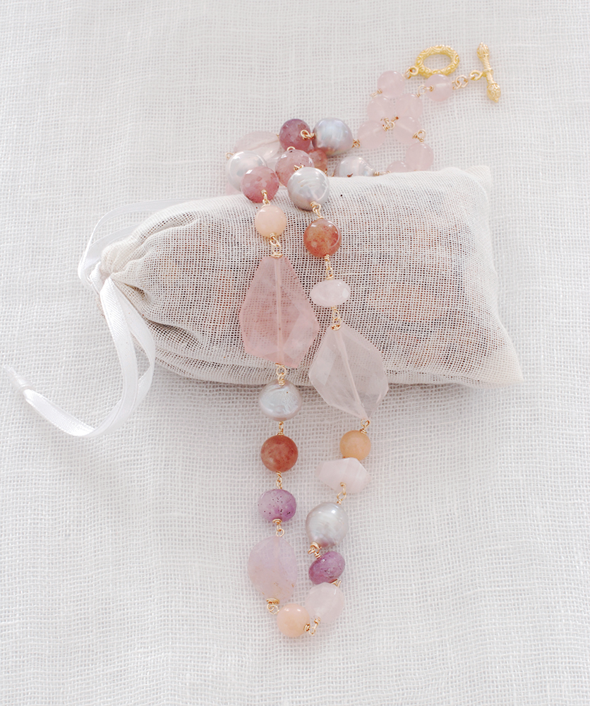 最も大きな素材はローズクオーツで22×18×4mm。大粒で美しいシルバーカラーのハイクオリティ淡水パールは14×10×10mm。とろけてしまいそうな優しいトーンのサファイアを6粒、7×10×10mmのめずらしいほどのボリュームがありながらも絶妙な気品溢れるファセッテドラウンデルカットを惜しみなく使い、全体の穏やかさにクラス感を添えました。このような役目を担えるのはサファイアならではだと思います。