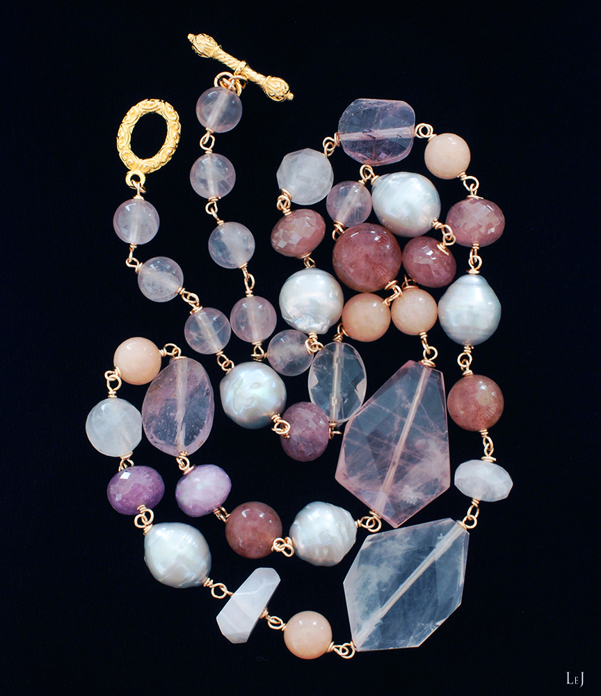素材:サファイア・バロックパール・モスコバイト・ローズクオーツ・アメジスト・ジェイド・K14ゴールドフィルド・ヴェルメイユ