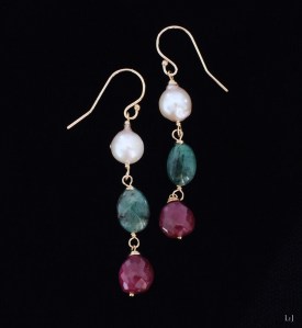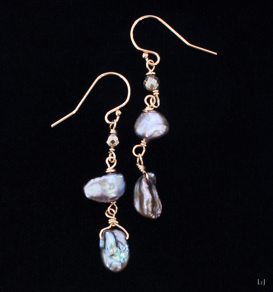 ケシパールのブルーがかったピーコックカラー、パイライトとのコンビネーションが落ち着いた華やかさをもつピアス