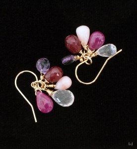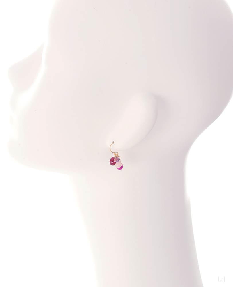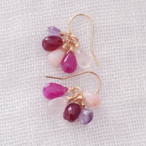 ローズクオーツのペールピンクからスリランカ産のルビーのフーシャピンクのブリオレット、アメジストのうすいヴァイオレットからピンクオパールのベビーピンク、コクのあるディープレッドのタンブルカットのルビーへ。ハイクオリティのブリオレットのスリランカ産ルビーで、全体にまろやかさとさりげないクラス感を添えました。