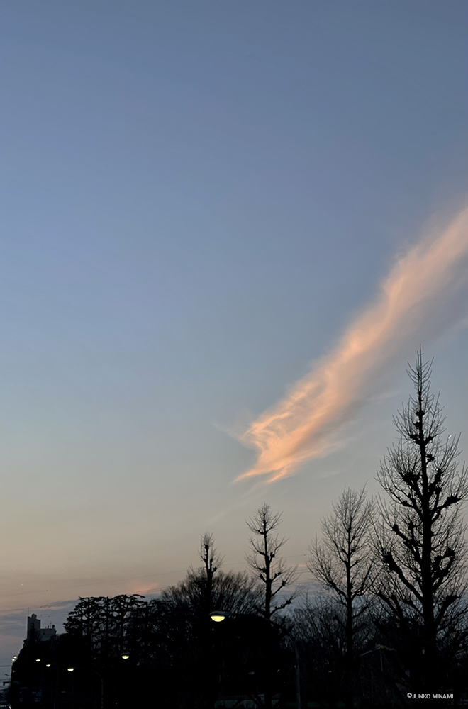 夕暮れの雲が、空から舞い降りてきた麒麟のイメージのように見えました。明日は雨の予報。