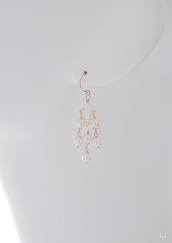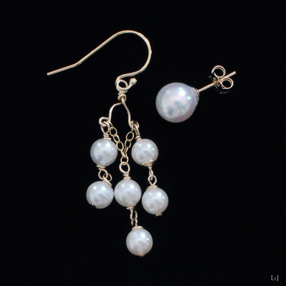 正統派のアコヤパールなので、個性的&クラシカル。大げさになることもなく、着けて楽しんでいただけるボリュームの仕上がりになりました。照りの良いクリーミーホワイト、ほのかなバロックのパールです。ボールポスト型は⌀8mm、シャンデリア型は⌀5mm、ピアスホールからの長さは45mm。