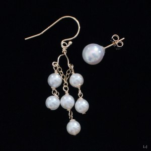 2種のサイズのアコヤパールで、ボールポスト型とシャンデリア型のアシンメトリーにしたピアス。