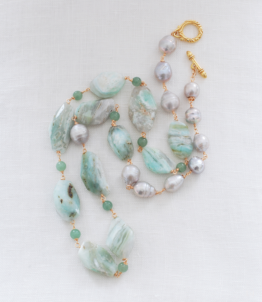 作っていても心躍るような美しいマチエールとすべすべした手触り、オパールならではの軽さでバロックパールとの相性もとてもよく、大人の女性に似合う仕上がりになりました。68cmの長さです。