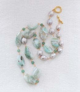 今週末には東京の最高気温が20℃ほどになるそうです。そんな季節に甘いブルーとグリーン系のネックレスを作りたくて、ブルーオパールとグリーンジェイド、シルキーな大粒パールを使いました。