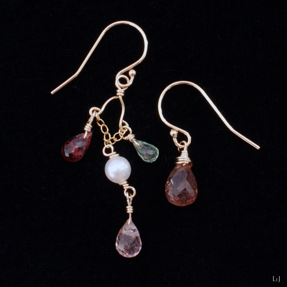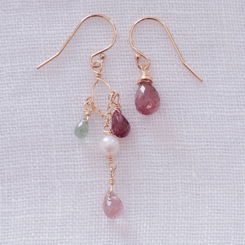 抑えたトーン、美しいカッティングのトルマリンとアコヤパールで、アシンメトリー・シャンデリア型のピアスを作りました。