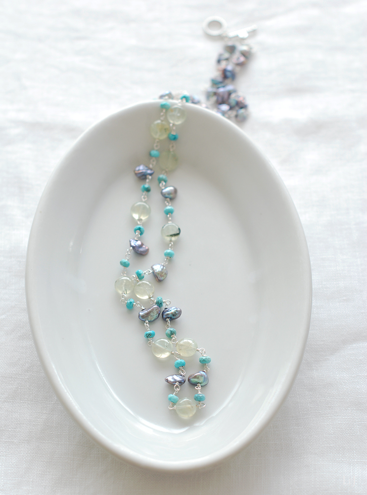 プリナイトはコインカット、ターコイズがリズムを作り、ケシパールがほんの少しの変調を添える。夏のドレスに、ニットに、秋冬のタートルにもコーディネートしていただけるジュエリーに仕上がりました。長さは81cm。