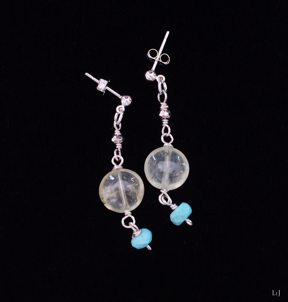 ちいさな果実のようなプリナイト、スリーピングビューティターコイズとパイライトのピアス。