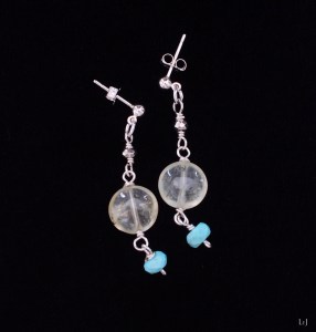 ⌀10mmのプリナイトはとても落ち着いたトーン、クリアブルーのスリーピングビューティターコイズがよく映えます。お手元のターコイズのジュエリーとのコーデもどうぞ。ピアスホールからの長さは36mm。