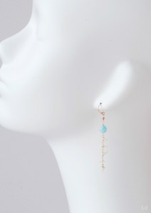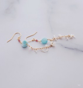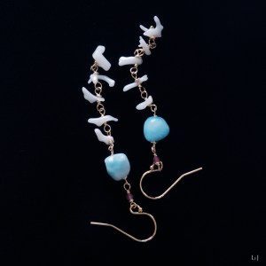 透明感と美しいカッティングのピンクトルマリン、幸福の天然石ラリマーと、フォルムのやわらかさが際立つホワイトコーラルを丁寧に紡いだロングピアス。