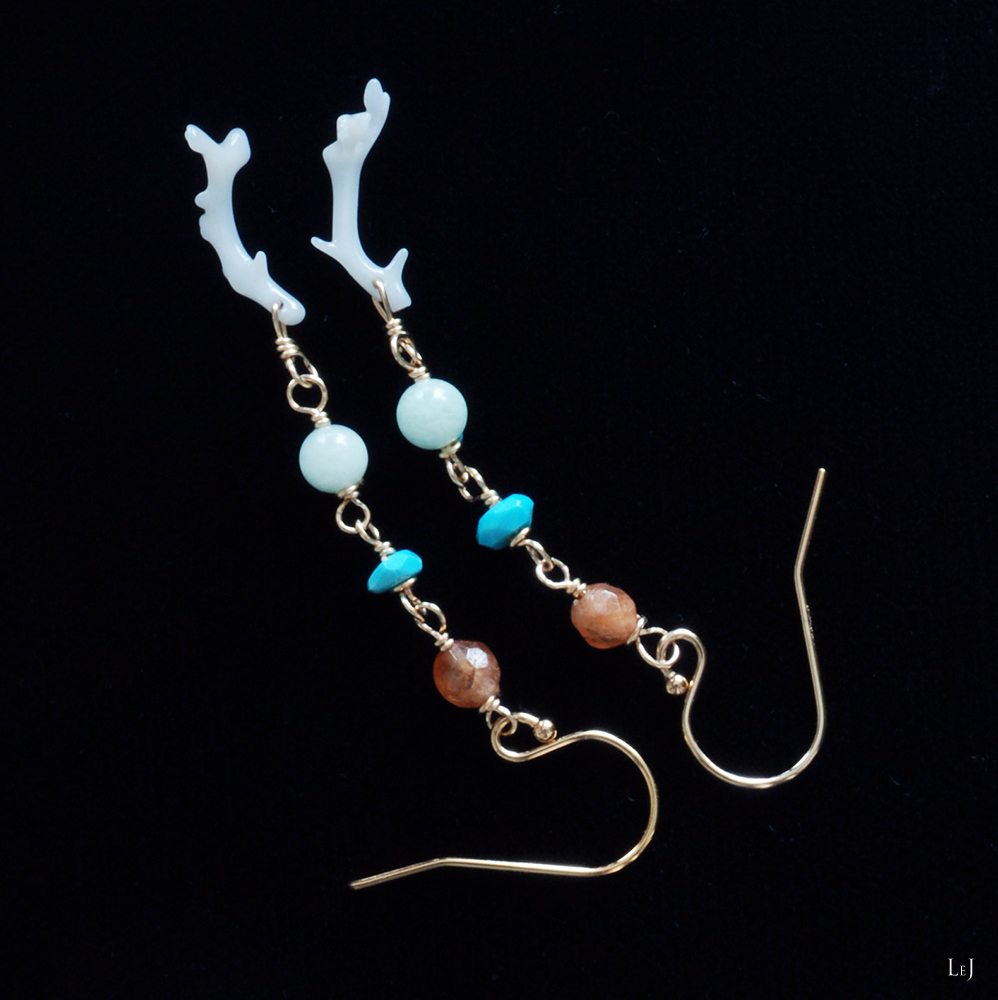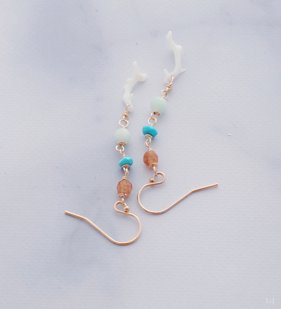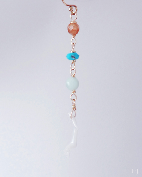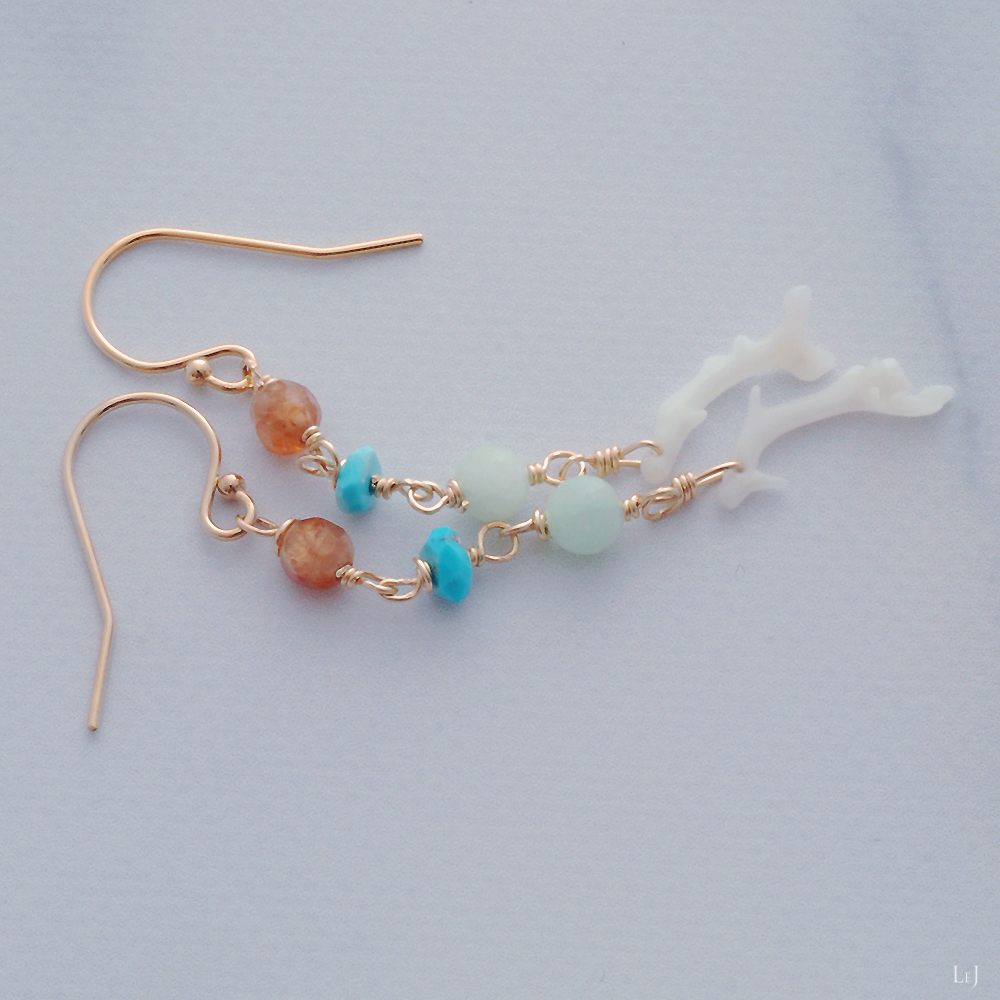 甘いブラウンの石はブラウンガーネット、くっきりとしたブルーのスリーピングビューティターコイズ、シャーベットグリーンのグリーンオーソクレーズそして白い枝珊瑚。
