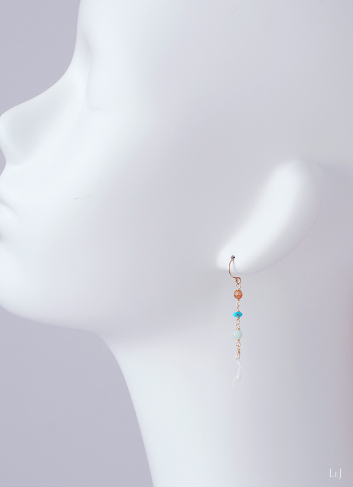 全体を甘いミドルトーンで纏めたロングピアス。これからの季節の、細番手のニットによく似合うジュエリーです。ピアスホールからの長さは56mm。とても華奢な素材で、軽い仕上がりになりました。イヤリングとしてもお薦めします。