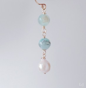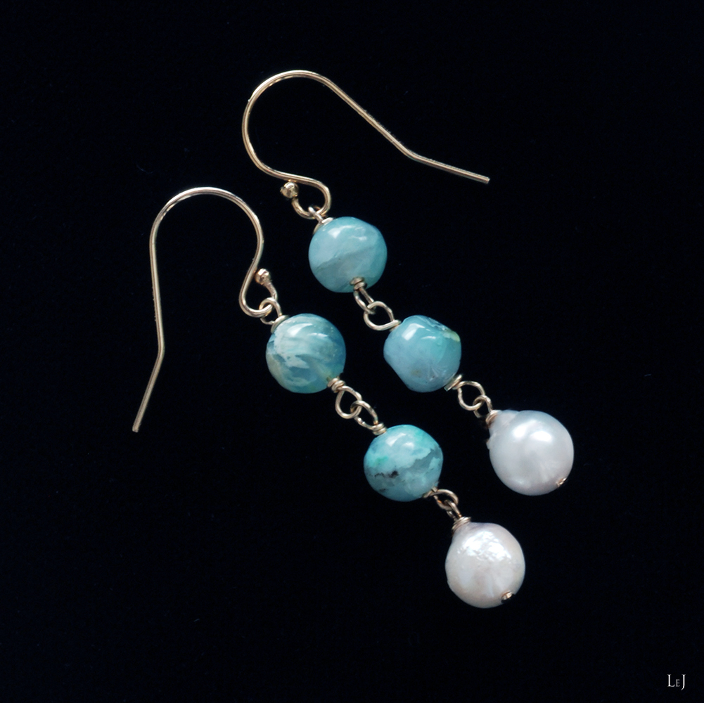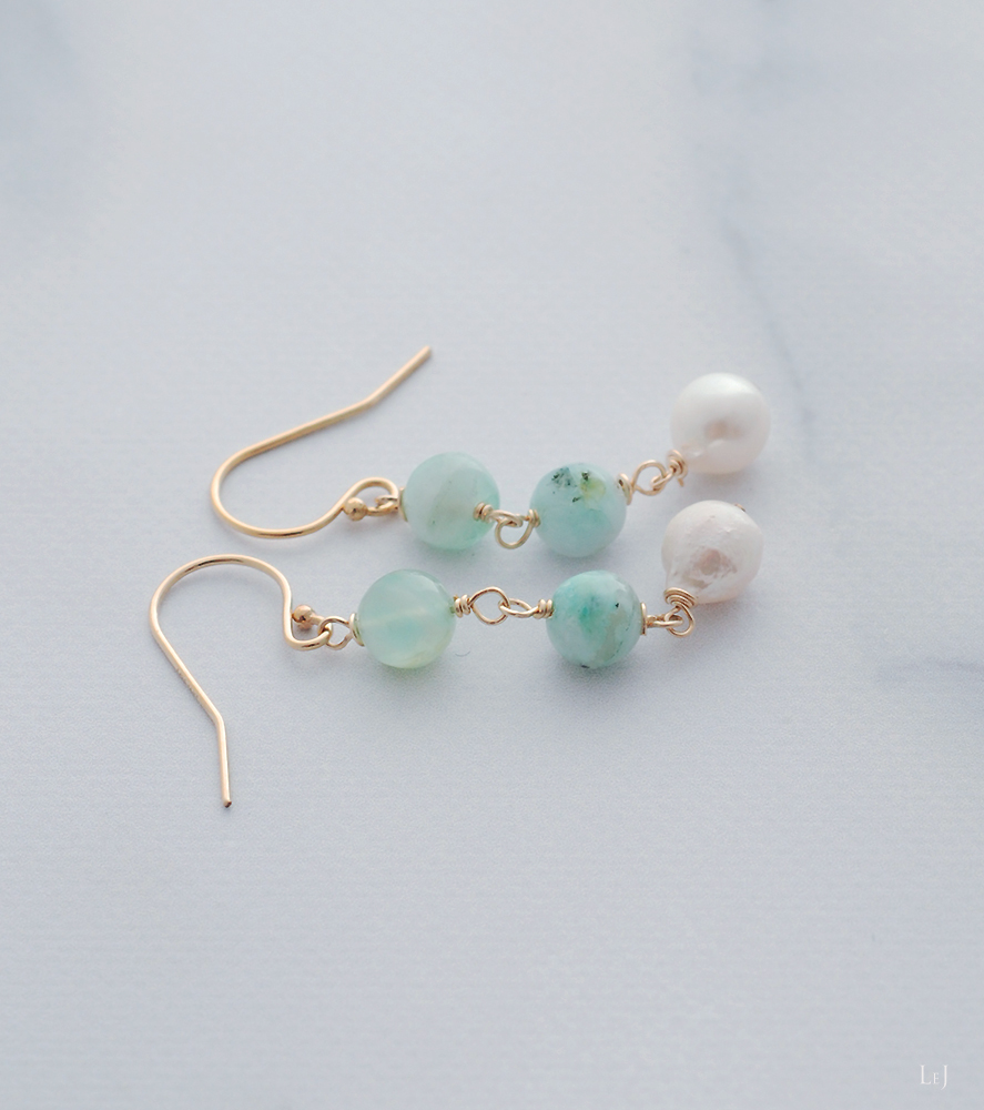 優しいグリーンにオパールがほのかに抱く内包物、パーツのゴールド色との相性がとてもよく映えて美しく、光を緩やかに湛えます。バロックのアコヤパールと合わせてみると、なんとも言えない愛おしさを感じる仕上がりになりました。オパールは軽い天然石なのでイヤリングにも適しています。オパールとバロックパールの組み合わせ、LeJらしいジュエリーです。