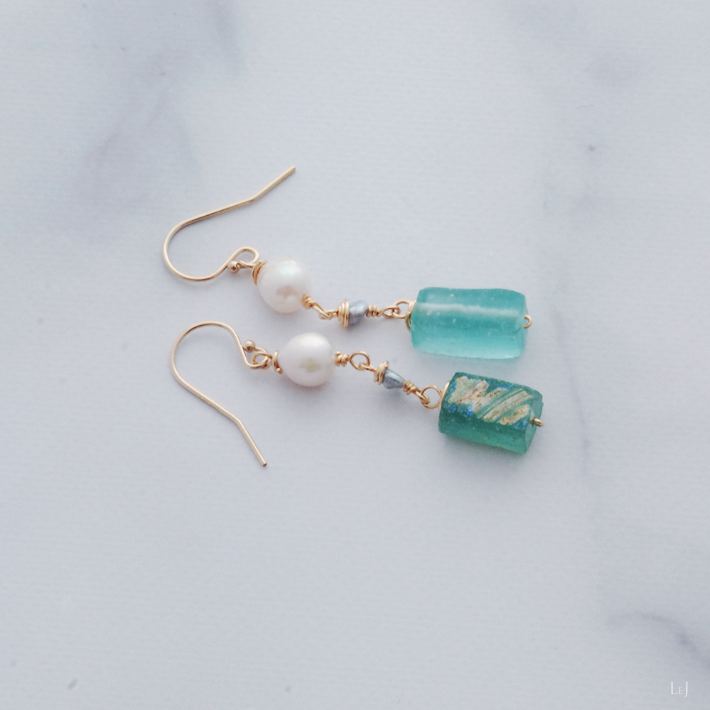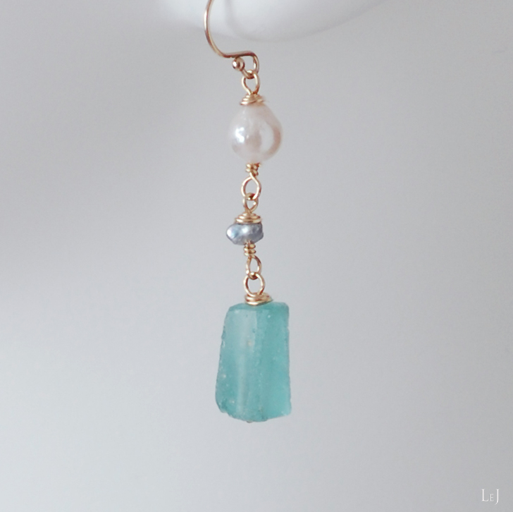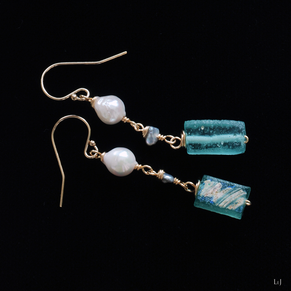 プリミティブ(素朴・原生的)な雰囲気を持ちながらも、LeJでは美しいガラス素材として製作に使っています。パールのジュエリーやシルバーのジュエリーとも仲良くなれる素材なので、コーディネートをお楽しみいただければと思います。ピアスホールからの長さは50mmと48mm。ローマングラスは14×7×5mmほど。