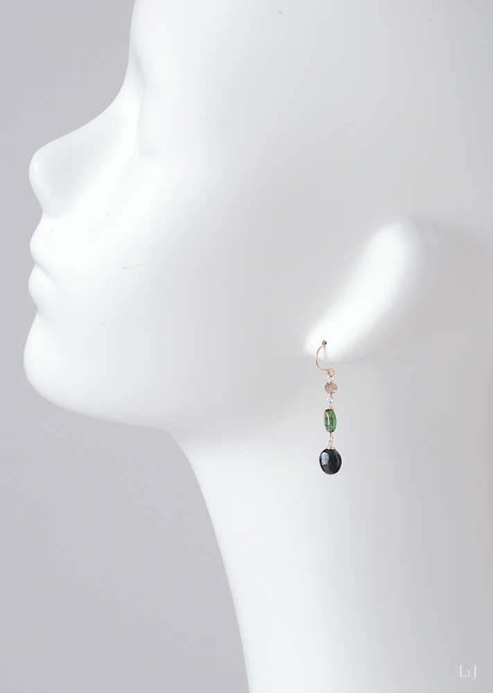 精緻なカットのアンダリュサイトと、こっくりとムーディなグリーントルマリンを2粒使って作ったピアスです。トルマリンはピンクのものをよく使って来ましたけれど、最近はこの、森の色のフォレストグリーンに惹かれます。オークル系の肌によく馴染み、肌を美しく見せてくれる色でもあります。トルマリンは大きい方の粒で10×8×7mmあり、しっかりした存在感を持っています。ピアスホールからの長さは45mm。