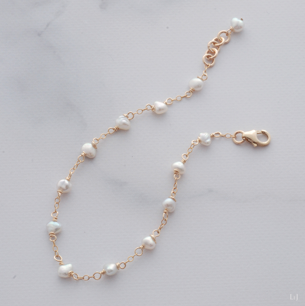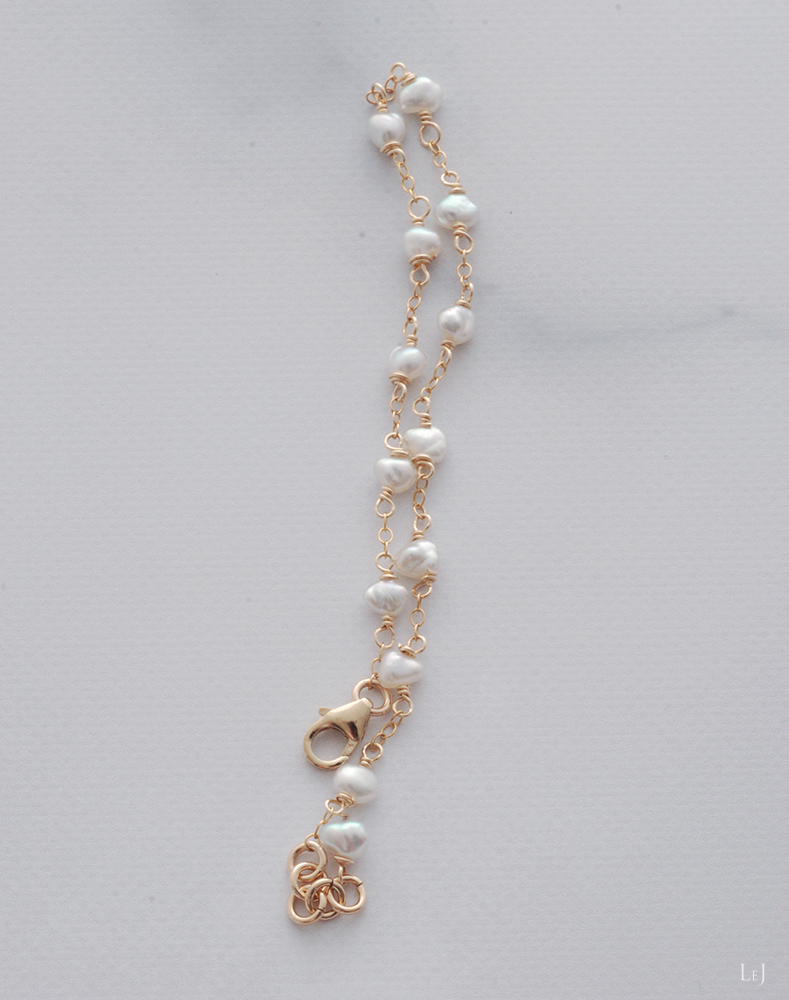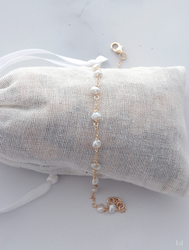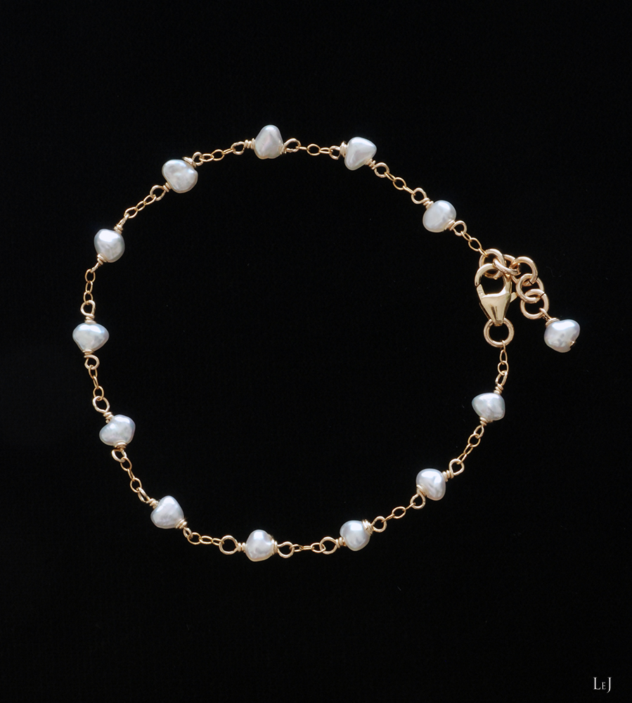 シャンデリアタイプのパールと同じロットのパールで、ブレスレットを作りました。真円のパールももちろん美しいけれど、いびつな形ならではの儚さや、小さなものだけが持つ愛らしさのようなものを感じさせるパールです。それでも輝きはアコヤパールならではのもの。